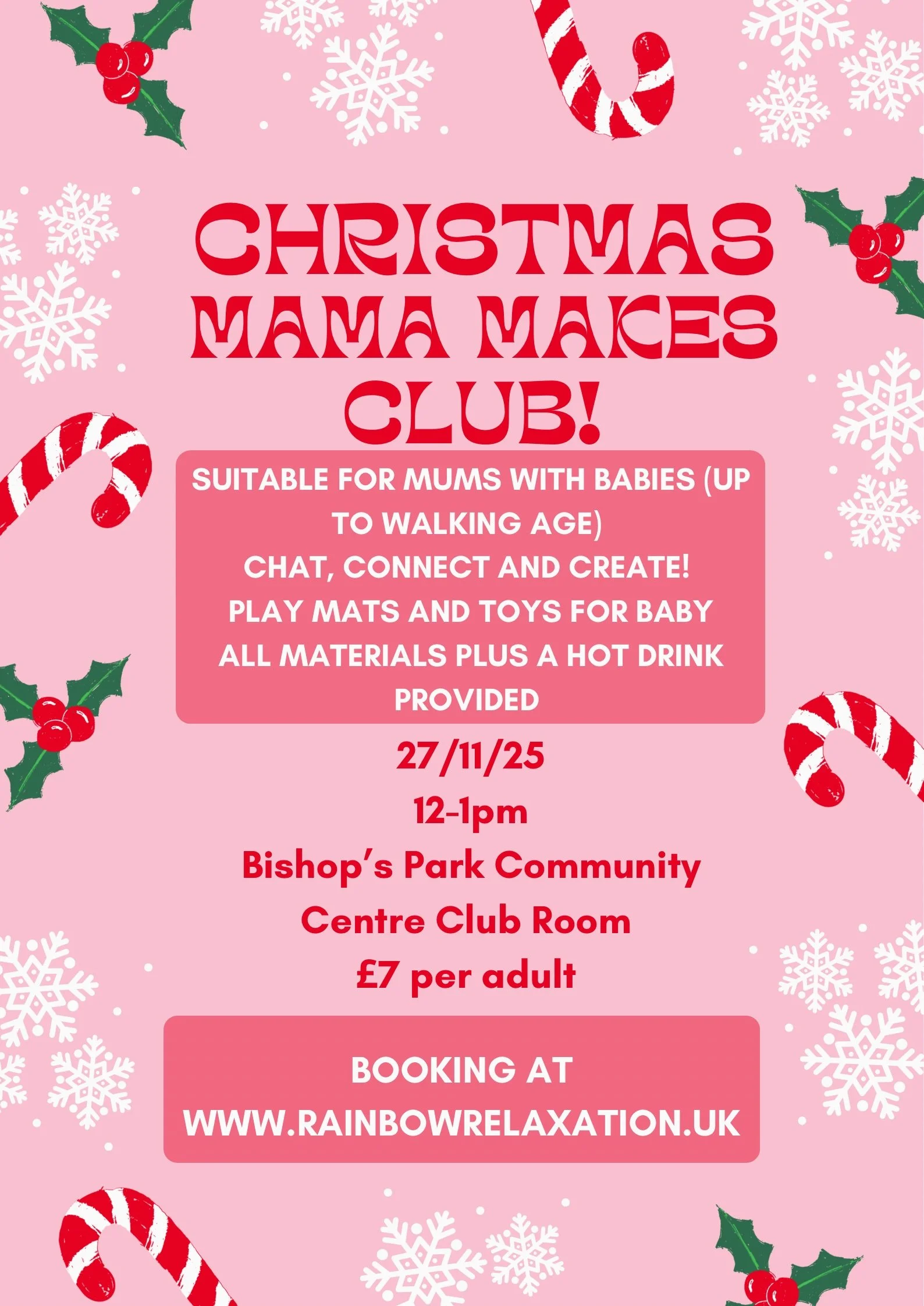 Booking page Parent and baby relaxation class DROP IN 11th Nov £8.00 Add To Cart Added! Afternoon session- Mama makes- Christmas craft event £7.00 Add To Cart Added! Morning session- Mama makes craft club- Christmas event £7.00 Add To Cart Added! Parent and baby relaxation class- November/December block £35.00 Add To Cart Added! 1:1 Baby Massage sessions x3 block £60.00 Add To Cart Added!